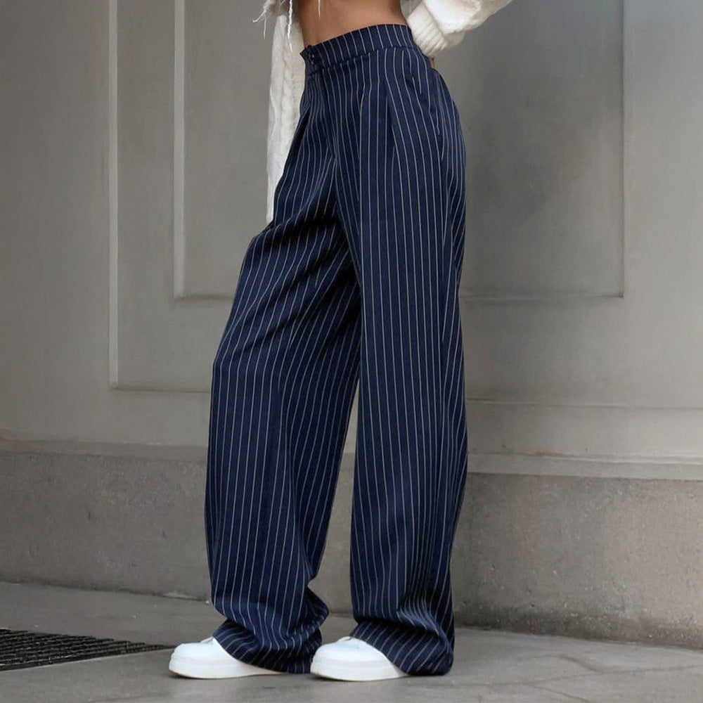 Navy pinstripe wide leg pants with a mid-waist fit and smooth polyester drape. A relaxed yet polished choice for everyday styling.